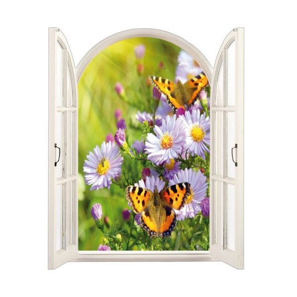 Sticker trompe l'oeil fenêtre papillons orange